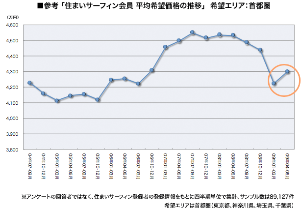 平均希望価格は、09年1-3月期は4200万円台と大幅に下がったが、09年4-6月期は4300万と回復傾向にある。会員の平均希望価格はマンションの売り出し価格と連動しており、09年1-3月期は値引き販売等で価格が下落していたが、09年4-6月期は売り出し値が上がっていると言える。